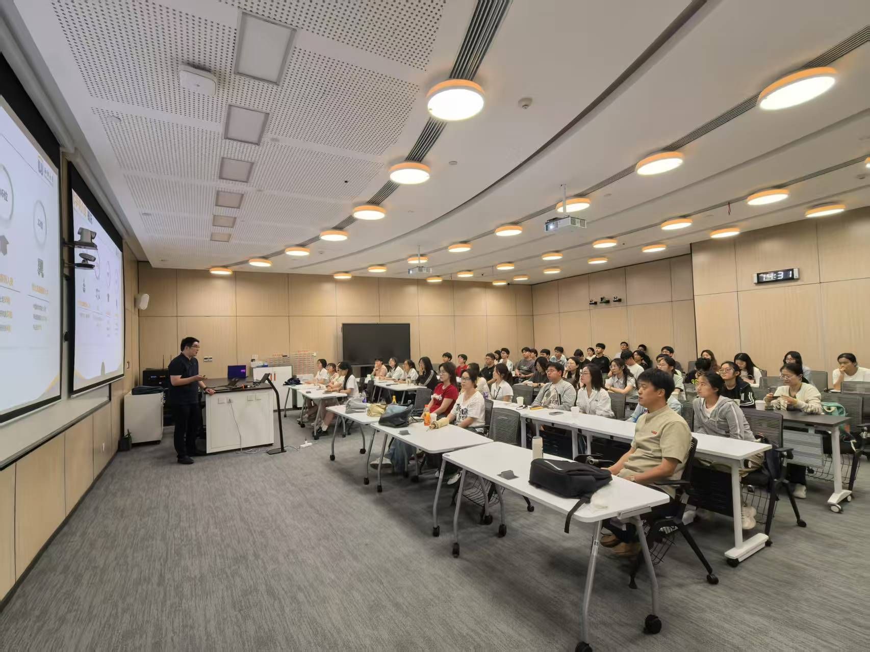 随后,在学院报告厅,西湖大学相关师生系统介绍了西湖大学理学院办学情况。化学系胡鹏飞老师介绍了系里的基本情况和全系老师的研究方向,通过深入浅出地介绍自己两项代表性研究工作全过程,生动展示了他所在课题组的基本情况,并与学院师生代表进行了深入交流。西湖大学理学院在读博士生代表张飞扬向参访师生介绍了什么人适合到西湖大学深造,如何申请到西湖大学深造以及到西湖大学后需要注意什么,从学生视角分享了切身感受。西湖大学化学系主任张鑫老师和赵传壮老师就学科建设、专业发展和人才培养进行了详细深入的交流和研讨。