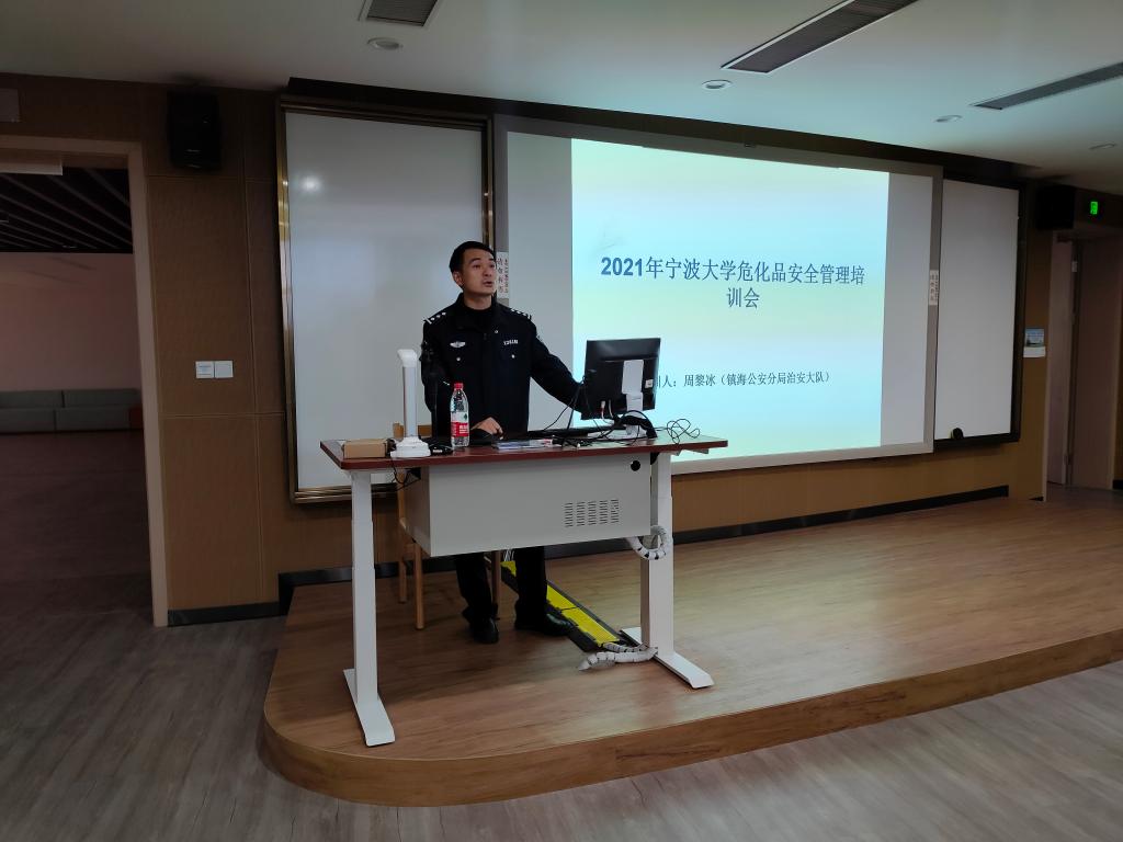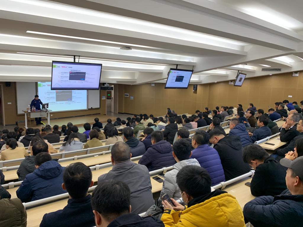 为了进一步提高实验室安全管理,切实增强实验室安全责任意识和事故应急处置能力,营造良好的实验室安全氛围。11月22日中午,由资产与实验室管理处主办,探花做爱 承办的实验室安全工作管理专题讲座在探花做爱 北区2号教学楼306室顺利举行。本次活动特别邀请了宁波市公安局镇海分局治安大队周黎冰警官和江北区消防救援大队刘慧明副大队长分别就危险化学品安全管理和消防安全做了精彩的讲座。本次讲座采用线下和线上直播相结合的方式,现场到会人数约150人,除了探花做爱 全体教师外,还有我校各学院和研究院的实验中心主任、安全员和危险化学品管理员;同时,探花做爱 的研究生和本科生共831人通过钉钉线上参与到本次讲座。