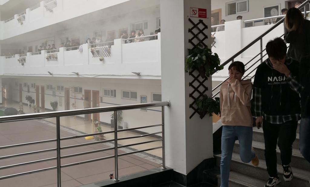本次消防安全教育活动由消防知识讲座,消防疏散、逃生演练,灭火演习三个环节组成。随着龙赛理科楼南楼内浓烟的升起以及紧接着消防警报声的响起,楼内同学纷纷捂住口鼻,弯腰低头按照疏散路线迅速跑到楼下。由于学院公共实验室内有大量学生在做实验课,开启紧急出口通道,便于同学快速撤离,到达安全场地。
