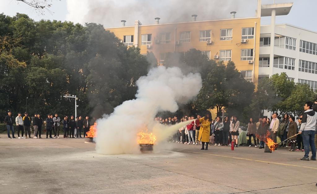 师生们撤离后,步行至甬江边广场,组织开展灭火器使用操作学习。保卫处相关负责人为现场的同学们详细讲授了遭遇火灾逃生时的注意事项和日常生活中的消防安全知识,并示范了灭火器的正确使用方法。
