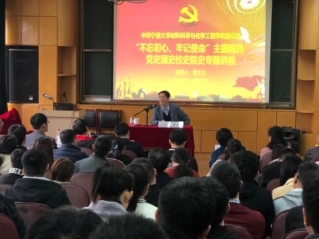 党委在龙赛理科南楼210报告厅举办“不忘初心、牢记使命”主题教育——党史国史校史院史专题讲座。宁波市经促会副会长兼秘书长黄士力作题为《回望历史显初心,展望未来扛使命》专题讲座。校党委委员张真柱,学院党政班子成员和全体师生党员等150多人参加了此次学习。