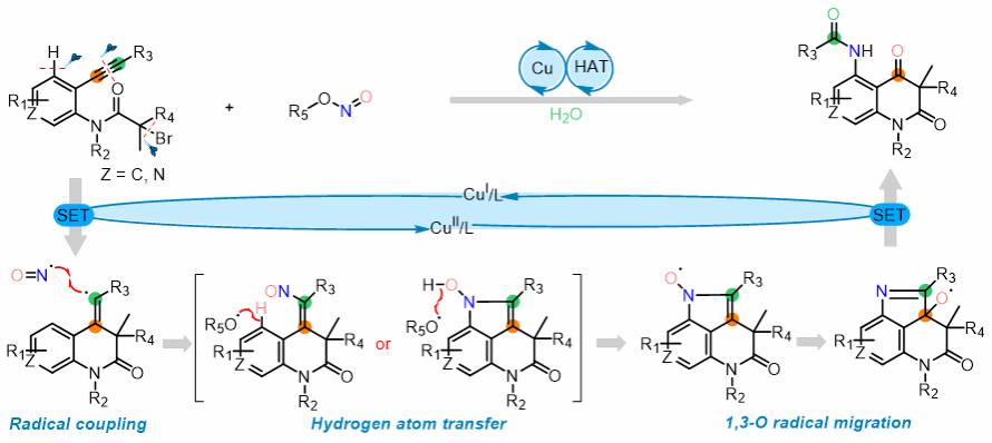 本工作利用α-羰基溴化物产生烷基自由基,首先与分子内碳碳三键选择性加成形成烯基自由基,并快速与亚硝酸酯原位产生的亚硝基自由基偶联。随后,经过氢原子转移形成关键的氧自由基中间体,其通过1,3-氧自由基迁移过程诱导碳碳键断裂实现芳基酰胺化。该方法利用廉价易得的亚硝酸酯作为氮源直接实现芳基酰胺化,打破了常规酰胺化需特定官能团底物、需添加缩合剂、副产物多的局限。此外,在亚硝酸酯作为氮源和氢原子转移试剂的双重功能作用下,碳碳三键转化为碳碳双键再转化为碳碳单键,精准实现碳碳三键断裂重组,为碳碳三键官能化开辟了新思路。控制实验结合密度泛函理论计算表明,亚硝酸酯产生的烷氧自由基基从芳基C(sp2)–H键或N-羟基五元环中间体攫取氢原子以诱导1,3-氧自由基迁移,是碳碳键成功断裂重组的关键。