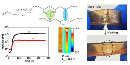翁更生教授团队提出了利用Ag+/Fe3+-催化丙烯酸及丙烯酸/共聚单体水溶液快速凝胶,实现共价交联聚合物水凝胶快速修复的全新策略。基于此原理得到的AgFe-PAA水凝胶同时含有共价交联与动态配位交联。交联动力学研究表明,56 s即能发生凝胶化,300 s左右的时间凝胶化即基本完成。Ag+或Fe3+的添加均能进一步加速该凝胶反应。制备得到的AgFe-PAA水凝胶具有高度的界面引发自由基聚合与凝胶化(IIG)的活性。利用此具有前端聚合效应的IIG反应,可以快速实现共价交联聚合物水凝胶室温、高效与快速的自修复。此IIG反应还可界面引发疏水性单体聚合,进而可实现水凝胶的增强增韧与保水性的提升。