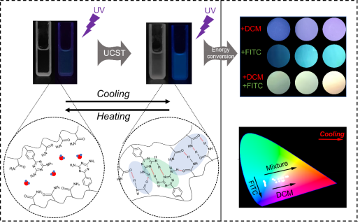 温敏性发光聚合物是一种在外界温度刺激下改变发光强度或波长的智能材料,在生物传感和细胞成像领域有着广阔的应用。目前,大多数温敏性发光聚合物的发光区域多位于蓝光波段,拓宽温敏性发光聚合物的发光波长对于其应用开发具有重要意义。本工作中,作者利用可逆加成-断链转移法制备了一系列丙烯酰胺(AAm)和6-(4-乙烯基苯)-2,4-二氨基-1,3,5-三嗪(VPhDT)共聚物,通过聚合物与染料之间的能量转移,构建了上临界溶解温度(UCST)型聚集诱导发光(AIE)聚合物荧光变色系统。AAm与VPhDT之间的强氢键作用使材料在特定特定条件下呈现出高温溶解、低温不溶的上临界溶解温度行为,这种温度响应性的链聚集同样影响了其发光行为。通过共聚物与染料之间的能量转移机构构建了一种温敏性荧光变色系统,可以通过调控染料种类和浓度、温度、pH实现颜色的宽波长范围内可调性,拓展了材料的应用领域。