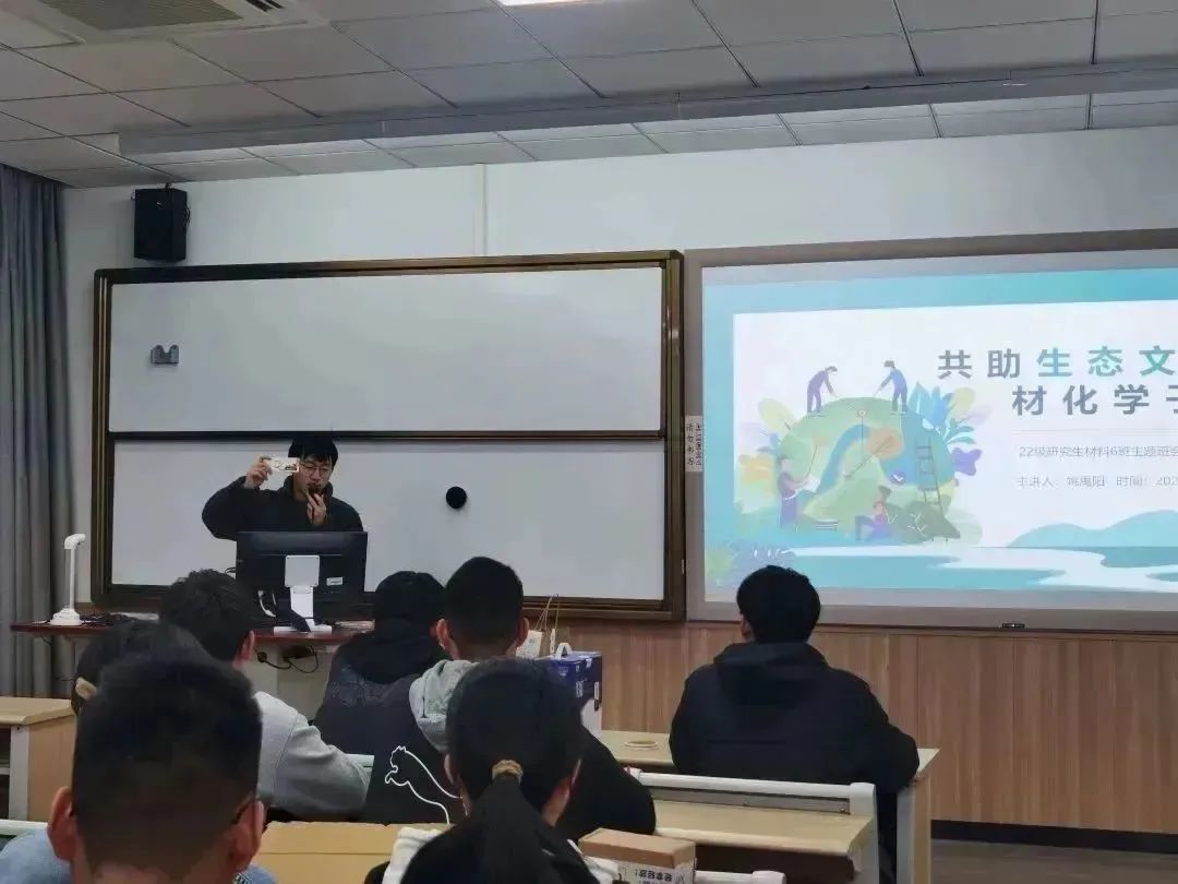3月27日,2022级研究生材料6班在北区2号教学楼202召开题为“共助生态文明,材化学子先行”的主题班会。辅导员姚禹阳从二十大报告中生态文明建设的重要性与紧迫性、生态文明建设的现状、生态文明建设的未来规划三方面出发,鼓励同学们将建设生态文明的责任与个人理想相结合,渗透到日常生活和科研的点点滴滴。班长闻思凡带领同学们开展生态文明建设知识竞赛,“互联网+”国赛银奖团队负责人孔英祺讲解“绿臻新材——生物全降解塑料母粒的破壁者”项目,让同学们对生物降解材料有了更深的了解,激发了立足专业特点助力生态文明的干事创业激情。最后,同学们组队完成“变废为宝”的手工制作,全体同学宣读生态倡议宣言并在“共助生态文明,材化学子先行”的横幅上签名,坚定了用所学回报社会、助力生态文明建设的决心。