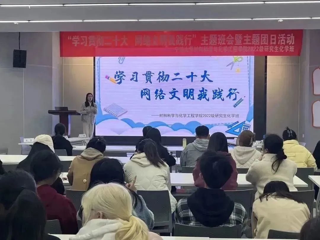 3月27日,2022级研究生化学班在S2S多功能厅开展“学习贯彻二十大,网络文明我践行”主题班会暨主题团日活动。辅导员芦意列举了违背网络安全的实例,宣讲网络法律条例,向同学们解释网络文明和网络安全的含义。同学们组队开展了辩题为“网络平台发言道德规范与法律约束何者更重要”网络文明行为辩论赛,双方辩手围绕辩题,陈词、盘问、驳论、对辩,引经据典,层层剖析,氛围异常激烈,道理愈辩愈明。最后,学生代表上台签倡议横幅,倡导“文明上网 从我做起”,班主任余镇重作班会总结。整场班会主题鲜明,形式丰富,有效增强了同学们的网络安全文明意识。