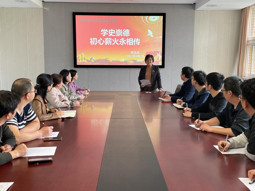 为庆祝建党100周年,响应党史学习教育号召,4月2日下午,材化院党委书记陈玉涓同志学院1227会议室和学院钉钉群,以线上和线下相结合的方式,开展了以“学史崇德 初心薪火永相传”为主题的专题党课教育,学院全体师生党员参加了此次学习。